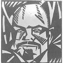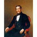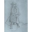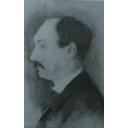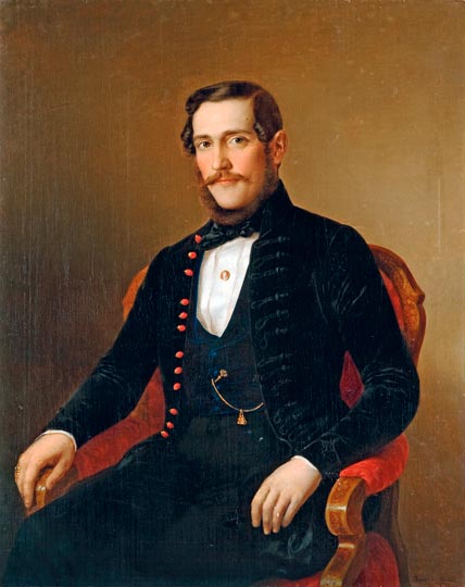 Jobb profilban ábrázolt, szürkés hajú és bajuszú, magasan záródó fekete kabátot viselő férfi. |