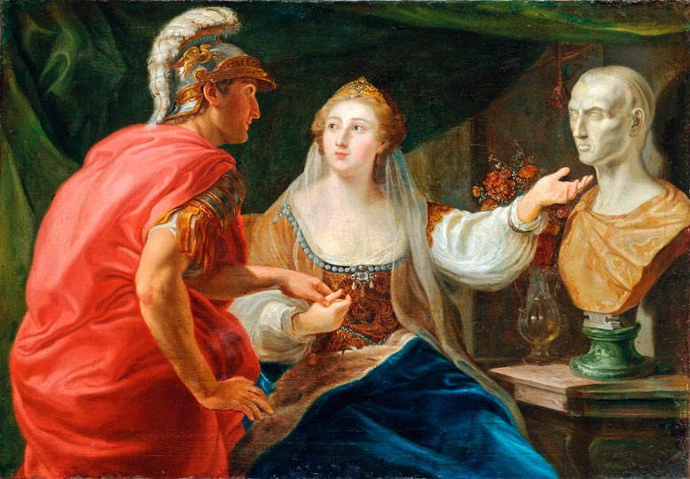 A kompozíció bal oldalán oszlopos épület előtt a sisakot, fehér ruhát és kék köpenyt viselő Minerva ül. Jobbját egy oroszlán fején nyugtatja, baljával egy üres pajzs felé mutat, amelyet két puttó emel a magasba. Középen egy lépcsőn a mezítelen fels |